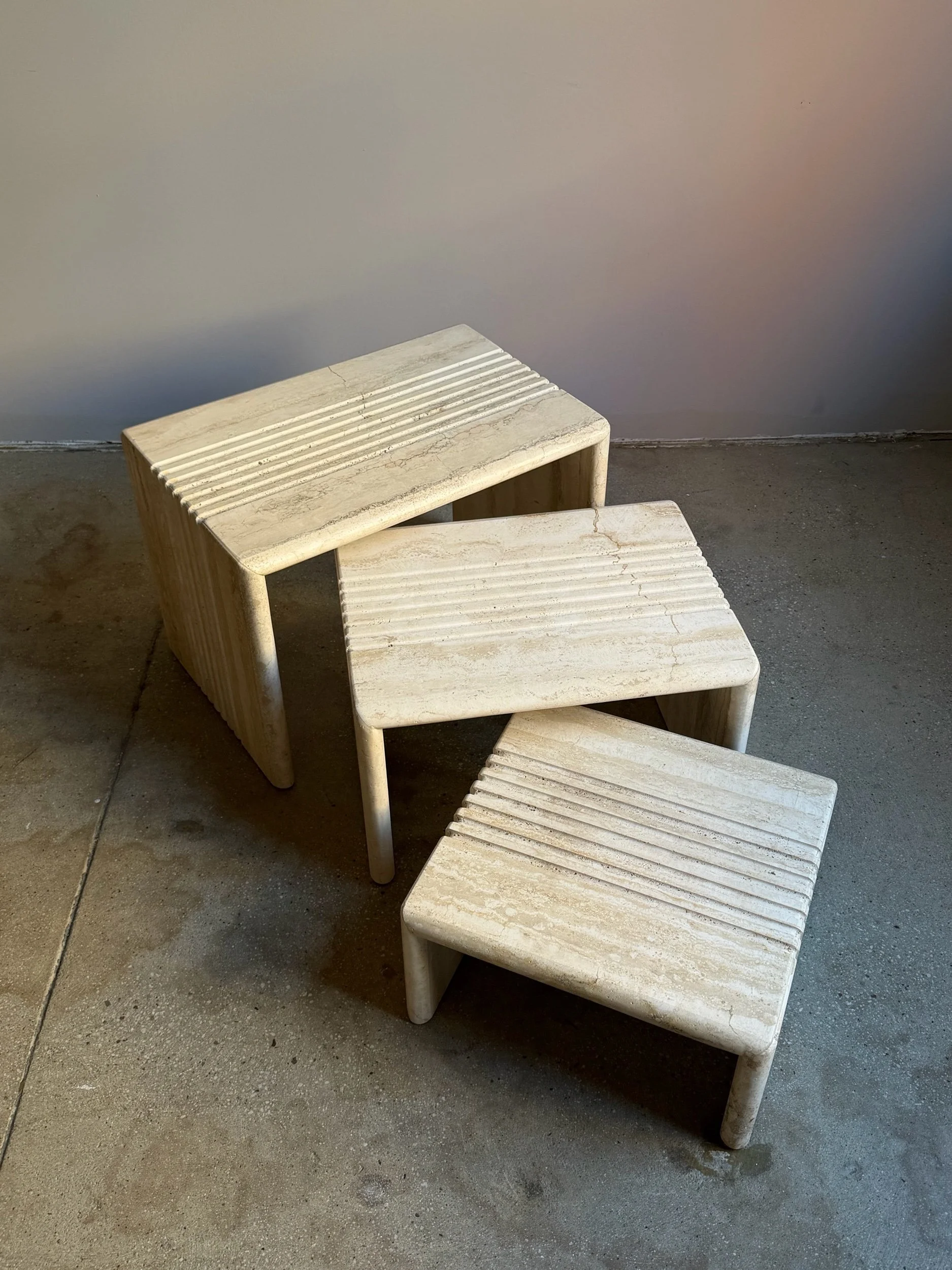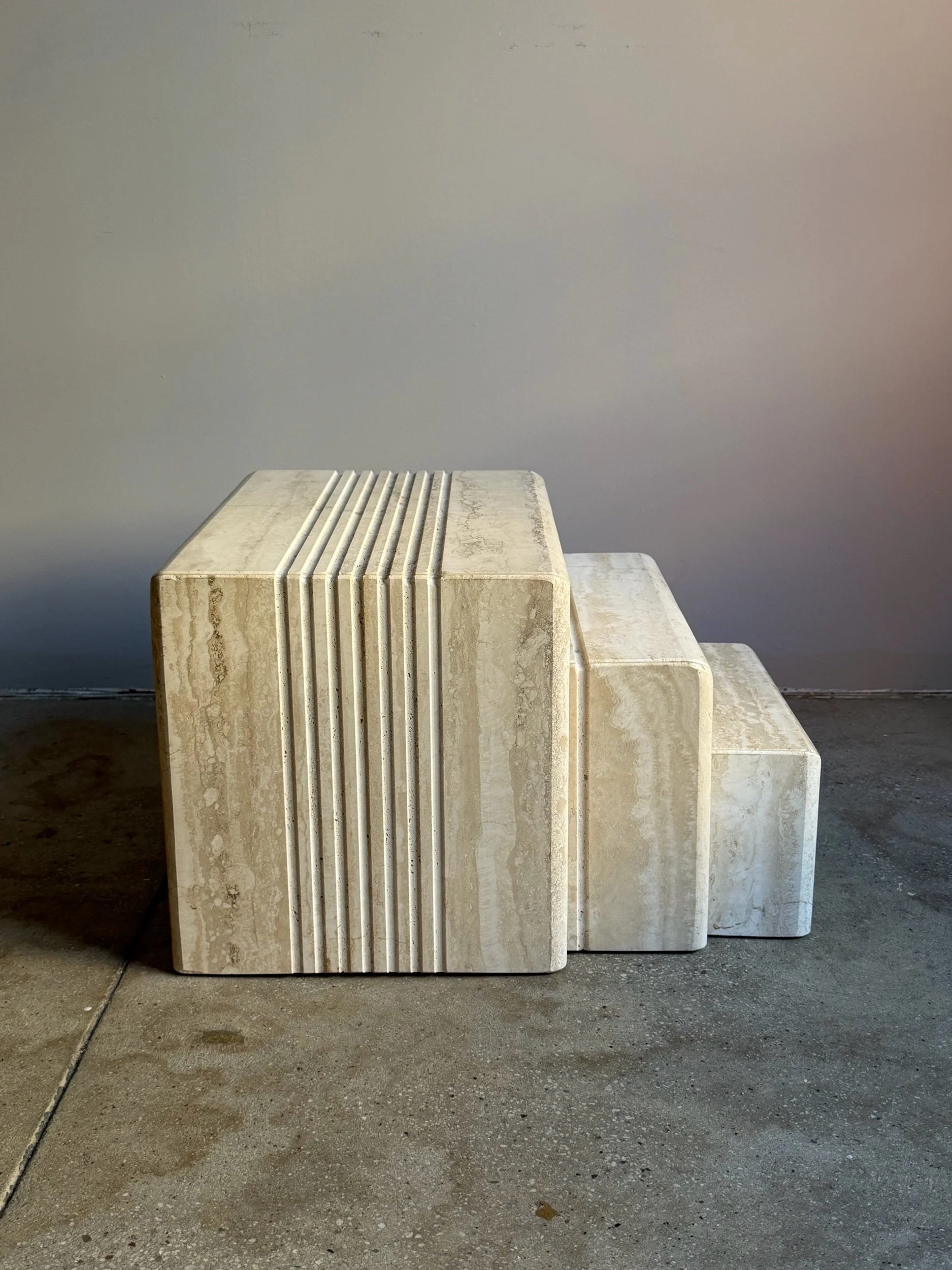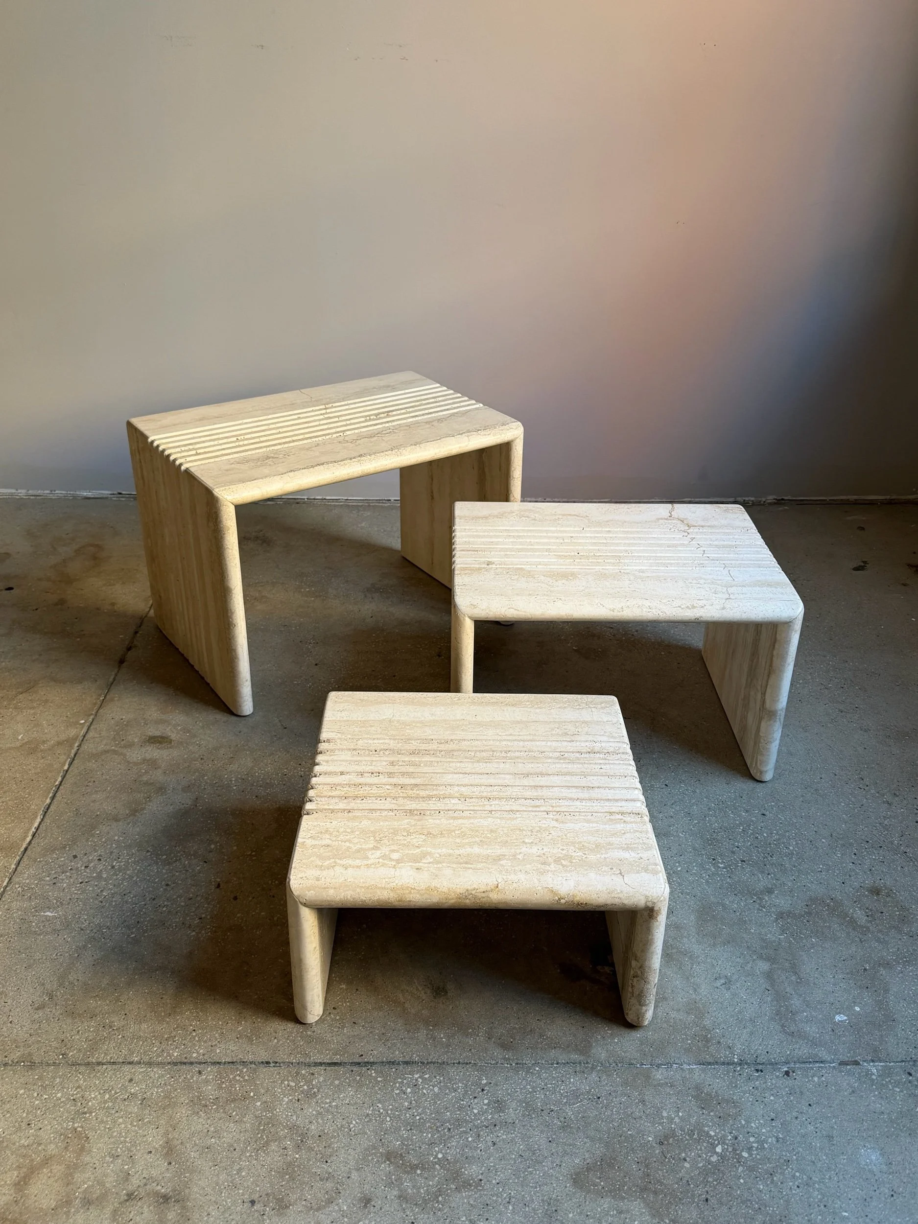 A set of three nesting side tables in solid travertine, designed in a stepped form typical of postmodern furniture. Each table is constructed as a U-shaped volume, allowing the smaller pieces to slide beneath the larger one.