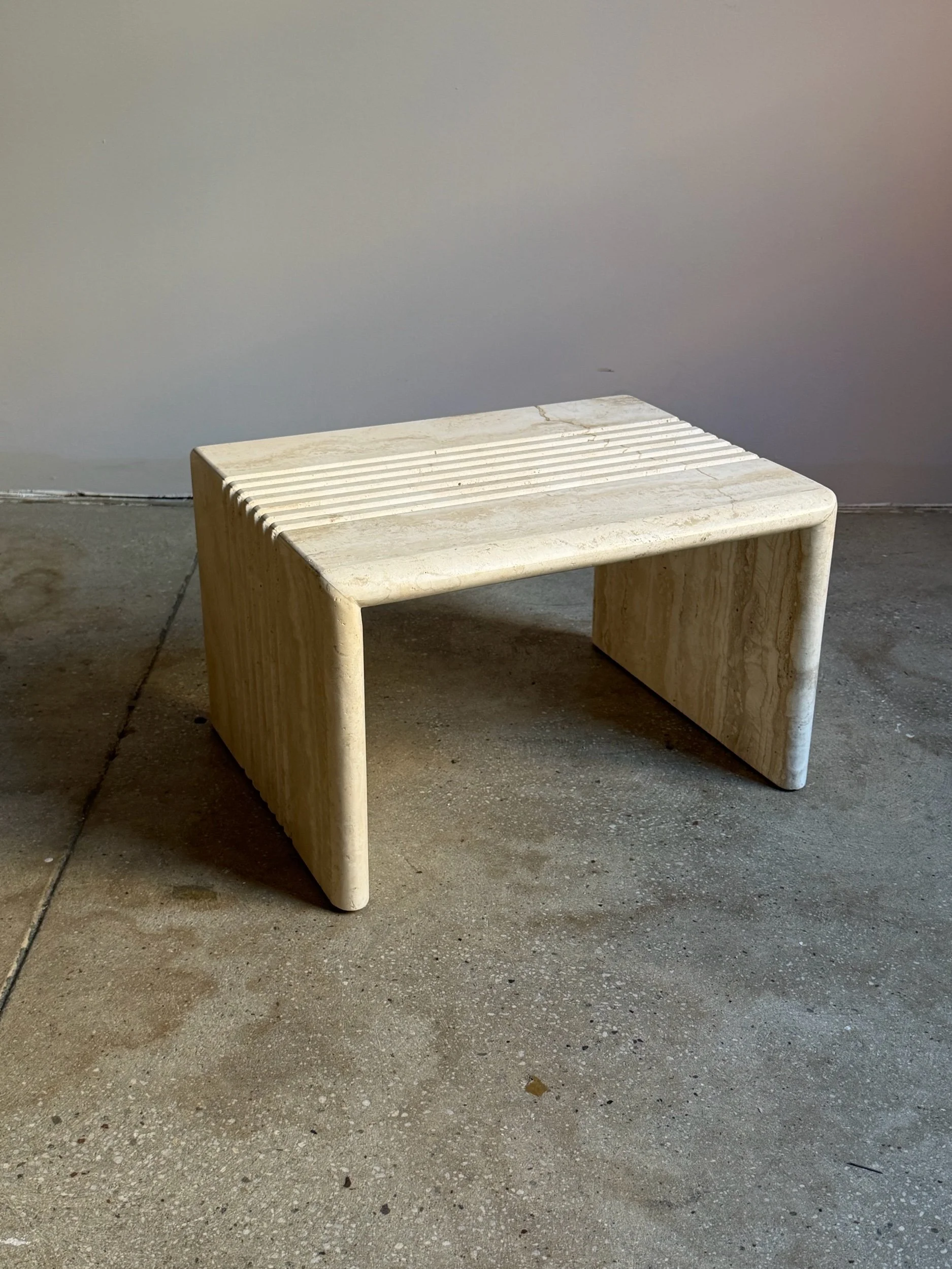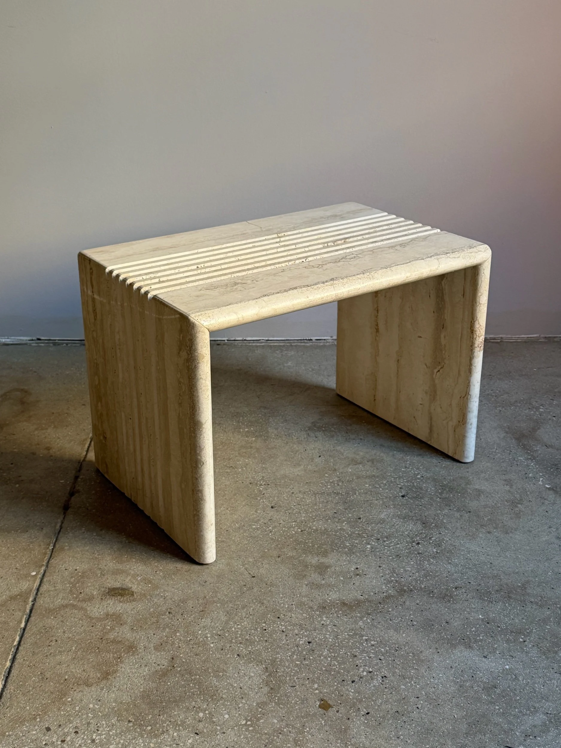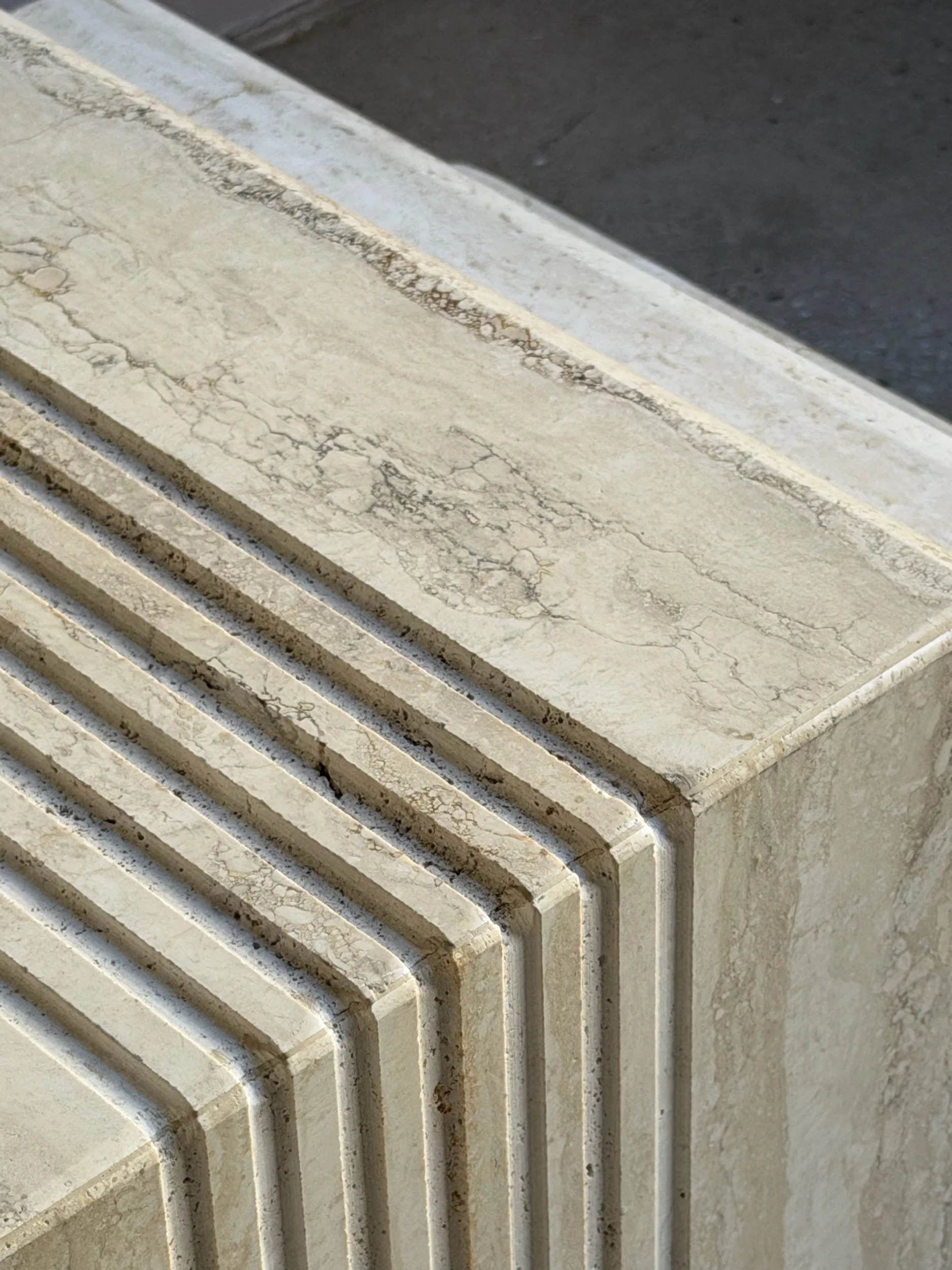 The surfaces feature a linear etched groove pattern across the tops and sides, creating a consistent ribbed texture. The travertine shows natural variation in tone and veining.