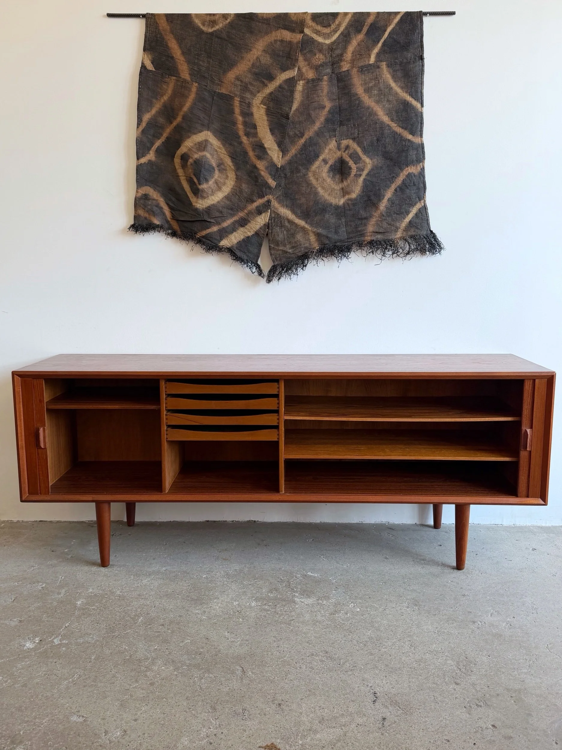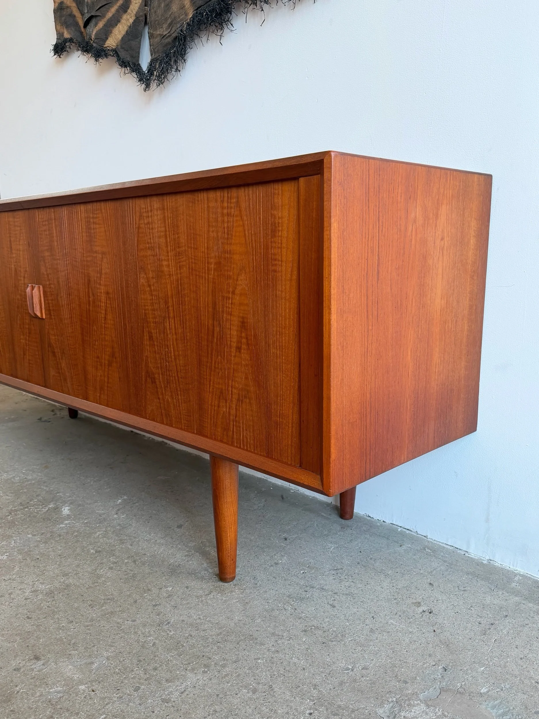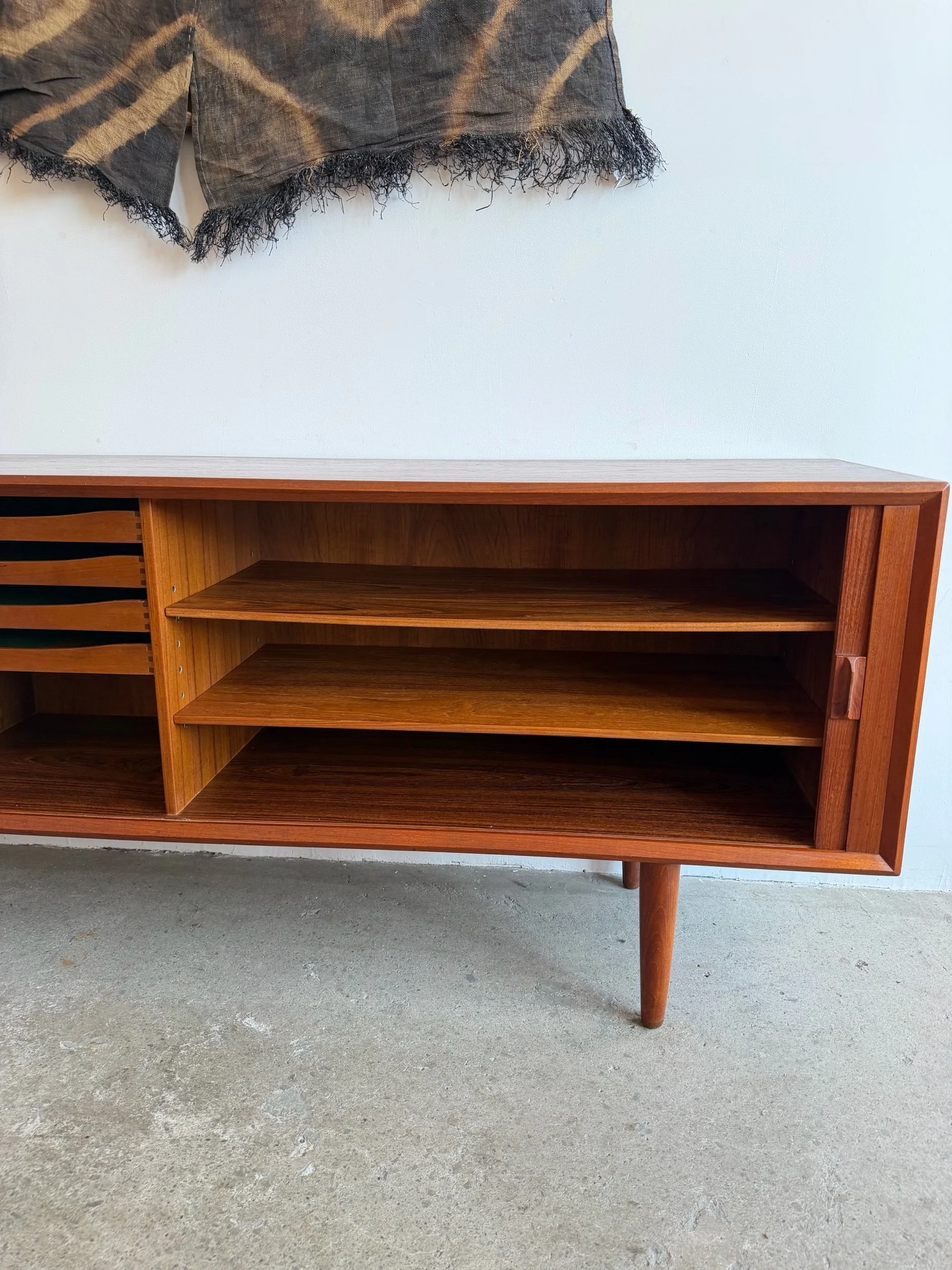 A Danish modern credenza designed by Svend Aage Larsen and produced by Faarup Møbelfabrik in Denmark, circa 1960s. Constructed in teak with a rectangular case raised on four tapered legs. The front features two tambour sliding doors with integrated pulls. Doors open smoothly to reveal interior storage compartments that include adjustable shelving and four drawers.