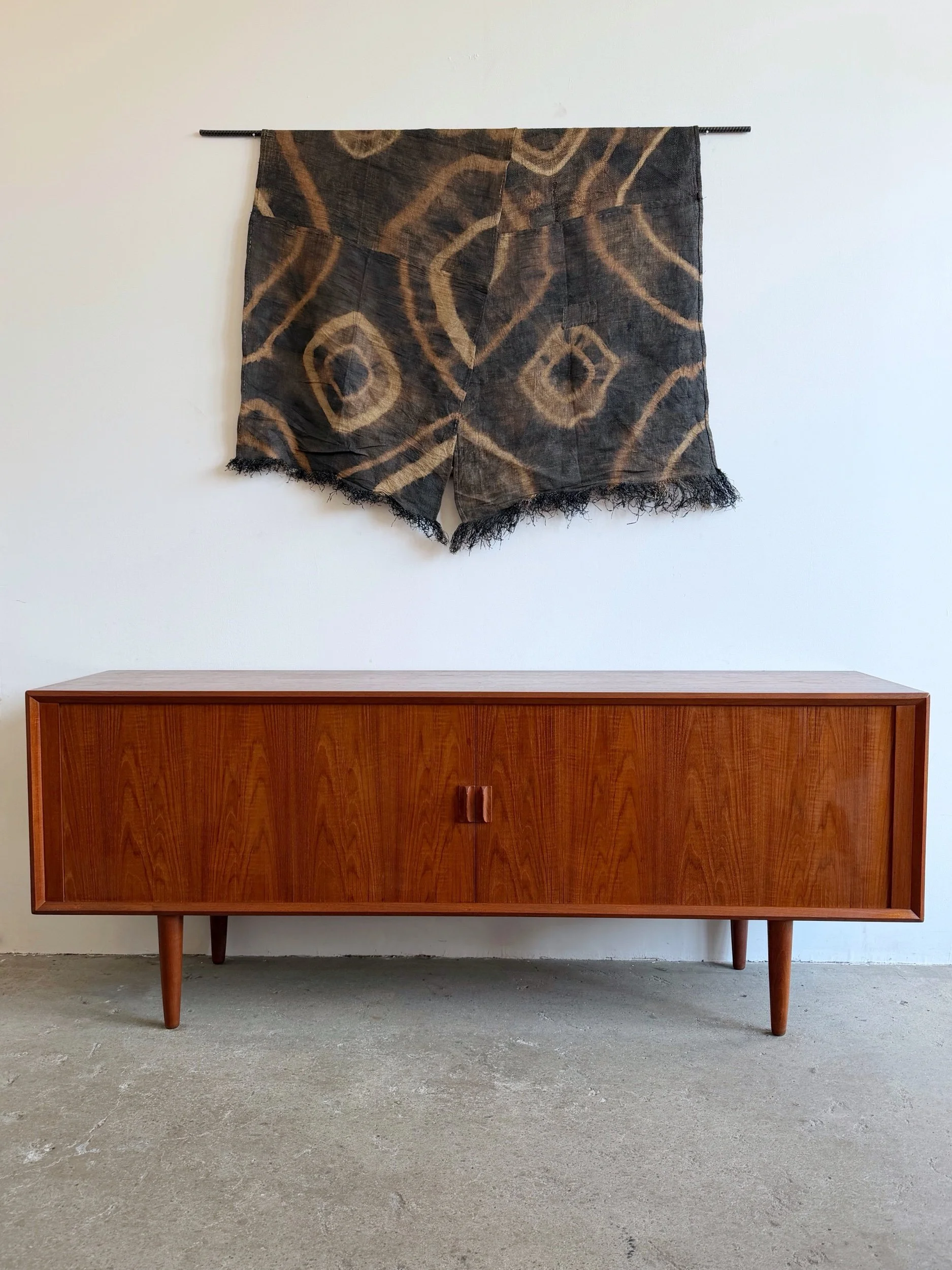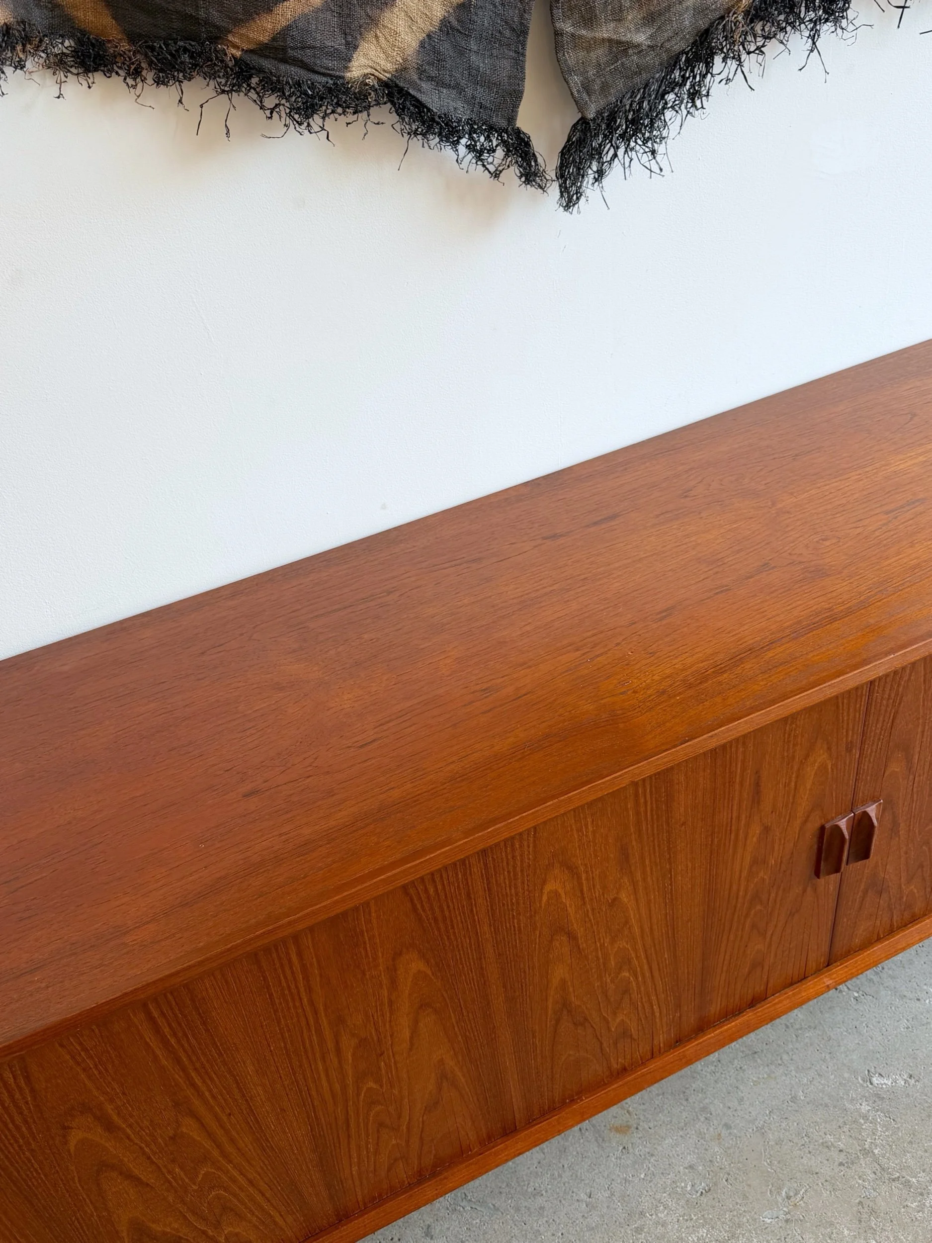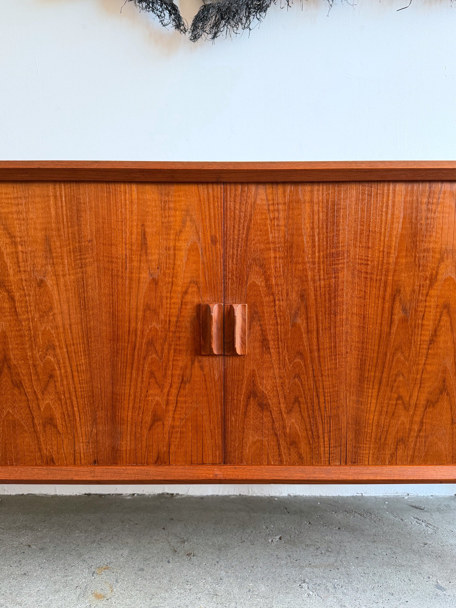 A Danish modern credenza designed by Svend Aage Larsen and produced by Faarup Møbelfabrik in Denmark, circa 1960s. Constructed in teak with a rectangular case raised on four tapered legs. The front features two tambour sliding doors with integrated pulls. Doors open smoothly to reveal interior storage compartments that include adjustable shelving and four drawers.